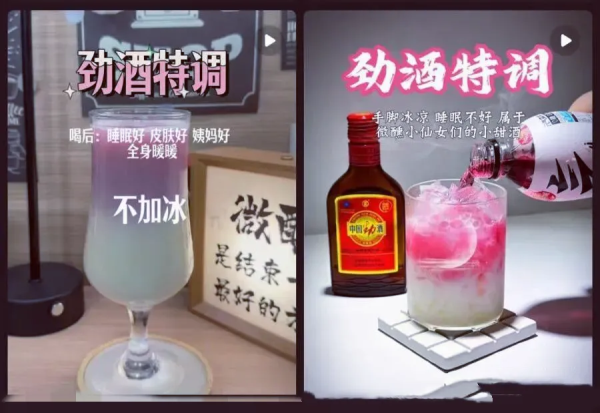 一方面,露酒品类的消费场景正从“功能性养生饮品”向“社交型饮用品”转型。其中,劲酒在社交平台的走红便是典型案例。年轻人在社交平台分享“劲酒+红牛/椰奶”等自制“养生特调”,这种被称为“姨妈神仙水”的喝法甚至一度让产品卖断货,而这将露酒推向了“健康微醺”的悦己消费新场景。