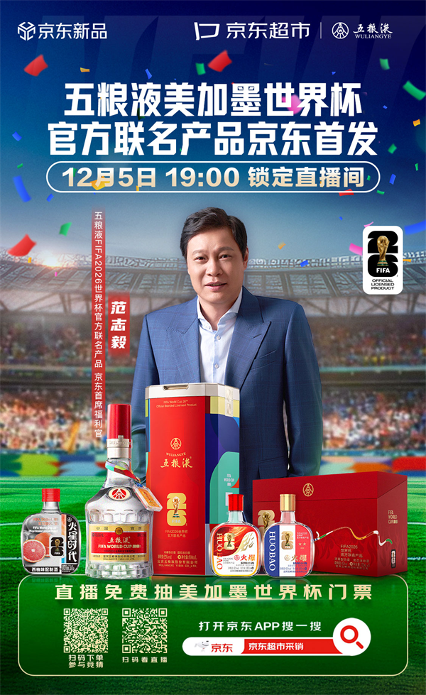 12月5日晚19:00,在即将举行2026世界杯小组赛抽签之际,五粮液将在“京东超市采销直播间”隆重举行五粮液美加墨世界杯官方联名产品京东首发直播活动,央视频客户端、视频号、微博和五粮液官方微博将同步直播。届时,这一系列承载着荣耀与梦想的联名佳酿将正式面向全球发售。