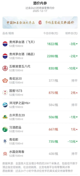 终端也迅速同步回涨。据新浪财经“酒价内参”对约200个采集点的实时监测数据显示,12月17日,53度500ml飞天茅台终端零售价约为1822元/瓶。各省份的行情数据也能印证这一点。据“广西酒类行业协会”“浙酒快讯”“速达酒价”等平台监测最新一期数据,飞天茅台区域价格大体保持在1700元之上。其中,广西报1720元/瓶,浙江报1700元/瓶,河北为1720元/瓶。各地报价整体集中、区间接近,反映出飞天茅台终端价格运行较为平稳,区域市场联动性和稳定性正在增强。
