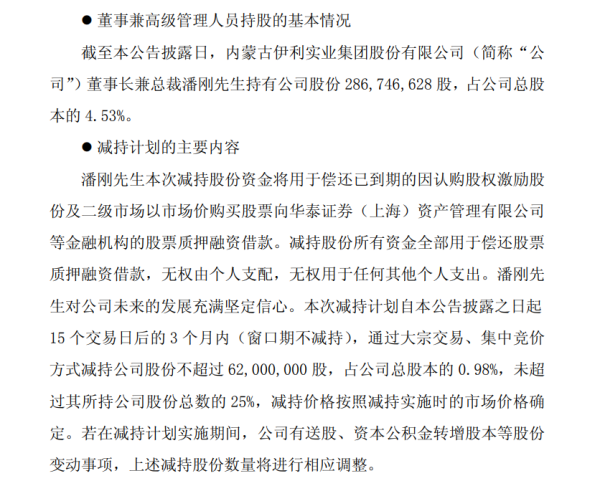 在公告中,伊利股份明确表示,潘刚先生本次减持股份资金将用于偿还已到期的因认购股权激励股份及二级市场以市场价购买股票向华泰证券(上海)资产管理有限公司等金融机构的股票质押融资借款。减持股份所有资金全部用于偿还股票质押融资借款,无权由个人支配,无权用于任何其他个人支出。