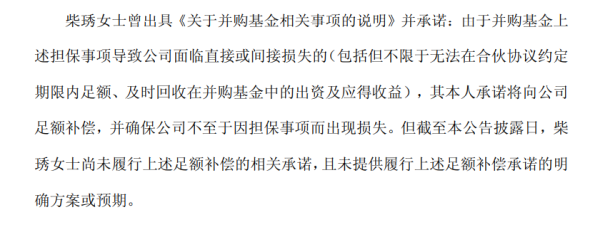 在事件发展过程中,柴琇曾参与设立这支并购基金,并为相关债务担保出具书面承诺。公告指出,柴琇曾明确表示,由于并购基金上述担保事项导致公司面临直接或间接损失的,其本人承诺将向公司足额补偿,并确保公司不至于因担保事项而出现损失。