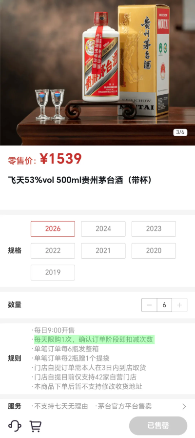 从12瓶到6瓶到限制下单次数,每一次收紧都在提高“黄牛”获取多瓶茅台的成本和难度。尤其是“每人每天仅限1单”的规则,切断了以往通过分多次下单来突破限购上限的操作路径,使得单个账户每天能获取的茅台数量被牢牢锁定在1至6瓶之间。