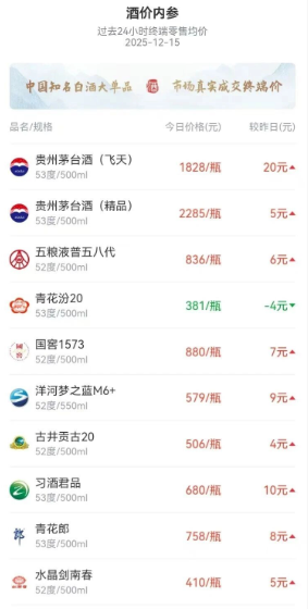 实际上,相较于批价的波动,飞天茅台在主要消费城市的终端零售均价整体表现更为平稳。新浪财经“酒价内参”对约200个采集点的实时监测数据显示,12月15日,53度500ml飞天茅台终端零售价约为1828元/瓶,相较昨日上涨20元,延续涨势。