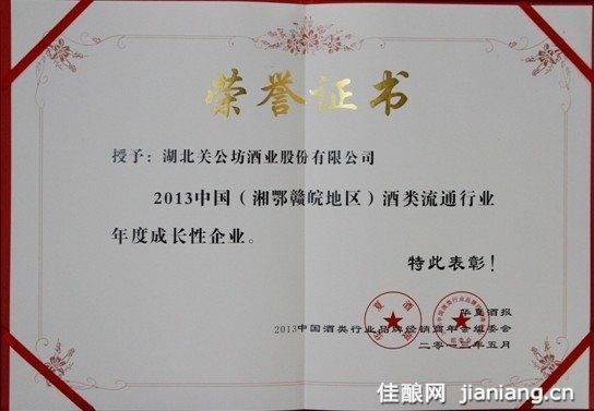 关公坊荣获中国酒类流通行业年度成长性企业奖